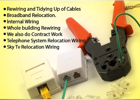 You can trust them with fixing telephone extensions, installing relocating telephone systems, rewiring and tidying up interior and exterior cables, installation and relocation of broadband, finding faults in interior and exterior wiring, rewiring, contract work, cable TV and sky TV installation and relocation, maintenance and fixing faults in cable TV and broadband.